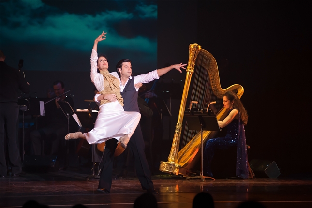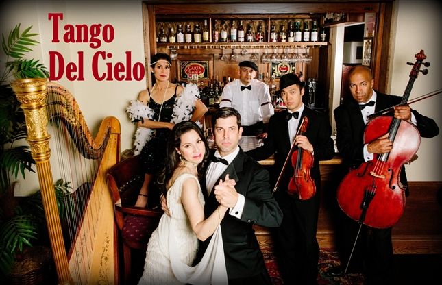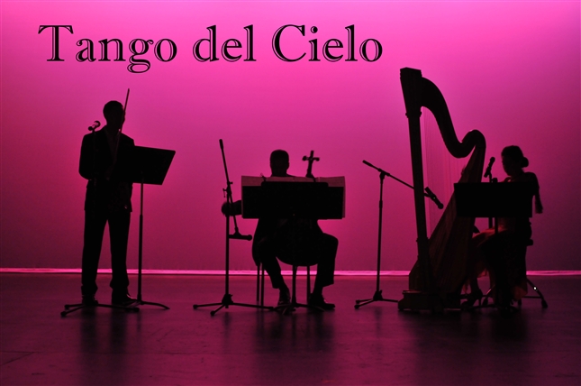 The current Tango Del Cielo is a multimedia concert with harp, strings and percussion, showcasing the tango, flamenco, classical and jazz music and dance of Latin America and Spain—also with film art, lighting effects, backdrops, sets, props, and vignettes, and also featuring award-winning Argentine tango and Flamenco dancers.