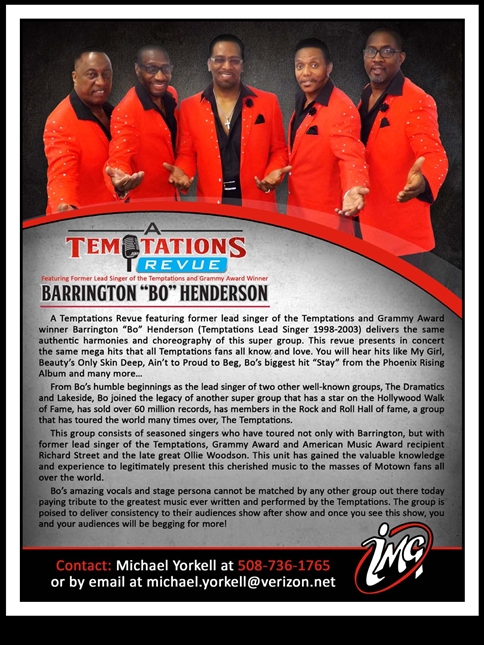 A Temptation's Revue featuring Grammy Award Winner, Barrington "Bo" Henderson, former lead singer of The Temptations '98 - '03. A Tribute To The Music Of The Temptations, the Motown sound and more. A Michael Yorkell/Hipshot Management production