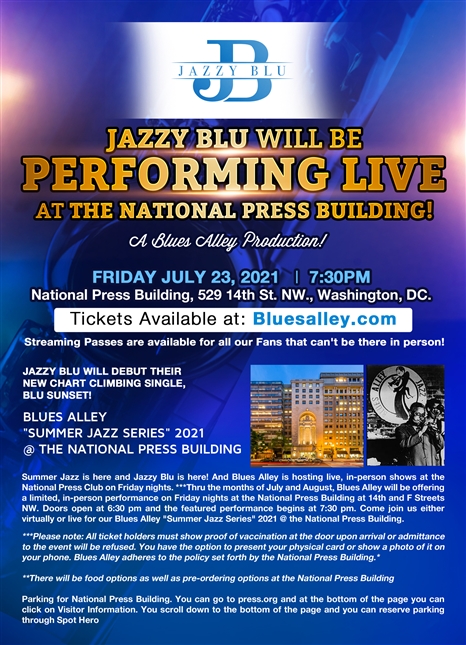 Jazzy Blu has entertained audiences everywhere from small lounges to large theaters. They have performed at various venues across the United States, from sold-out crowds at the historic Washington, D.C. landmark Blues Alley, to the infamous Kennedy Center, Lincoln Theatre, The Hippodrome, Middle C Jazz, Rams Head, Tin Pan and Howard Theatre, Keystone Korner Baltimore, MGM National Harbor and more!